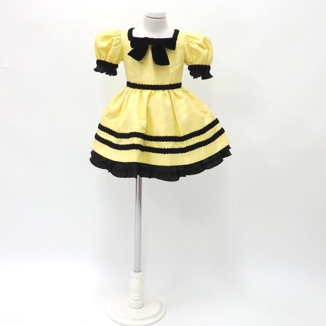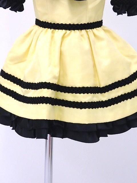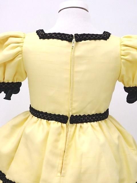■淡い黄色のシャンタン生地にベルベット調生地の黒のリボンと刺繍モチーフが飾られた、パフスリーブのワンピースドレスです。