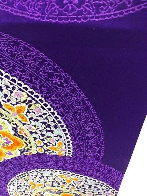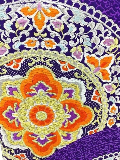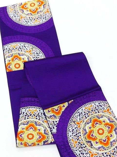 ■青味の強い紫の地色に大きな華紋が織り込まれた六通帯です。