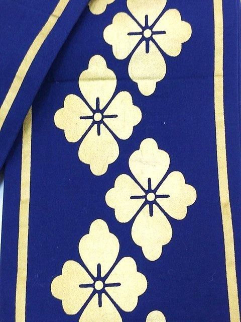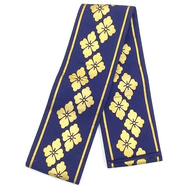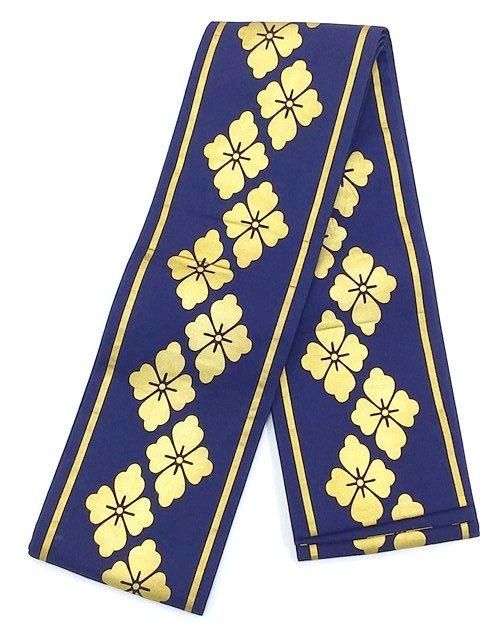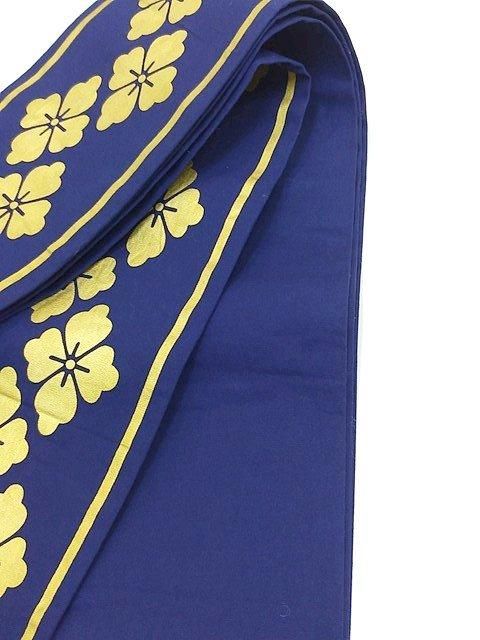 ■紺色の綿生地に金の花菱の紋柄が入った半巾帯です。