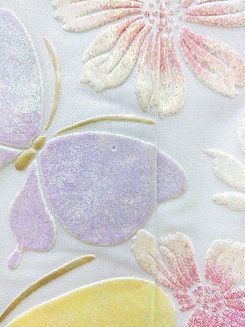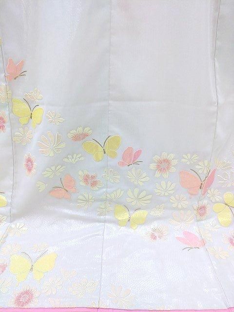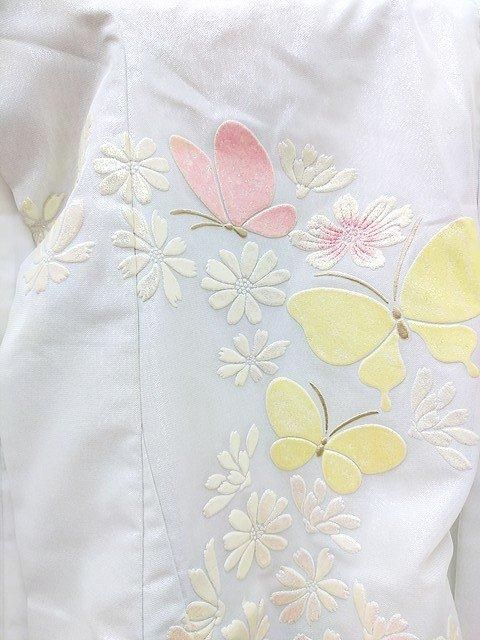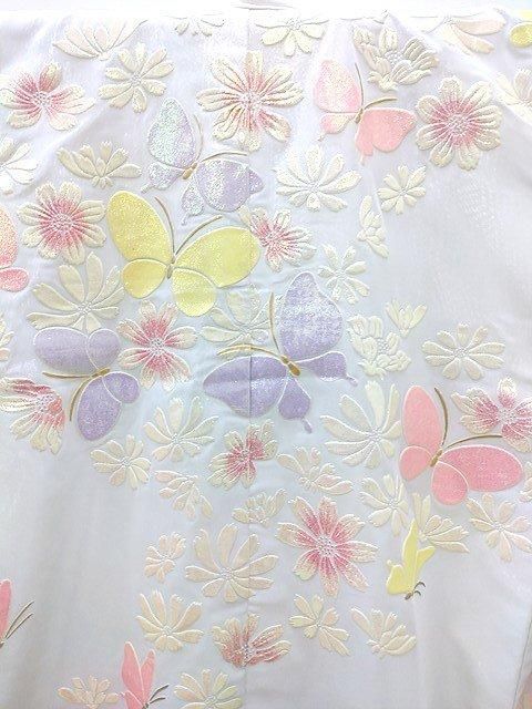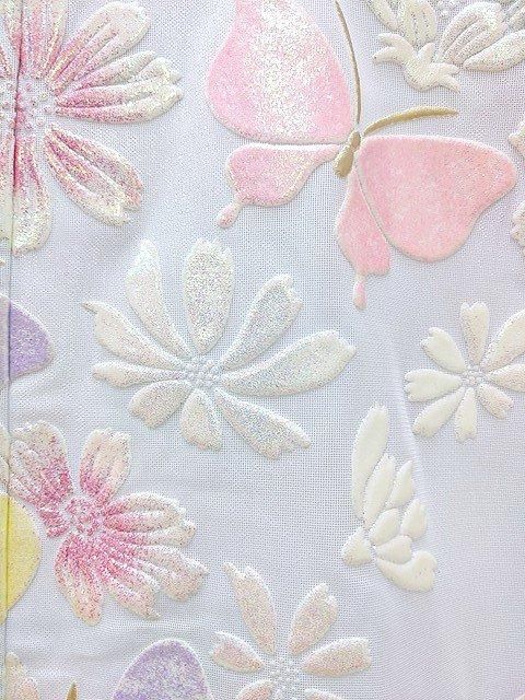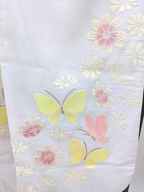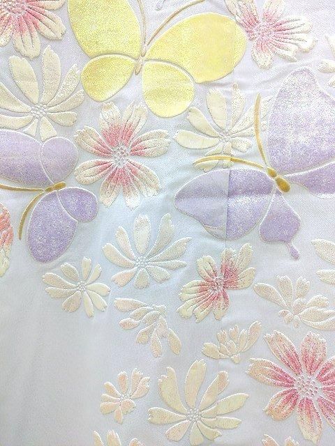 ■白の地色にピンクや紫、黄色などのパステルカラーを使った蝶や秋桜風の花柄です。