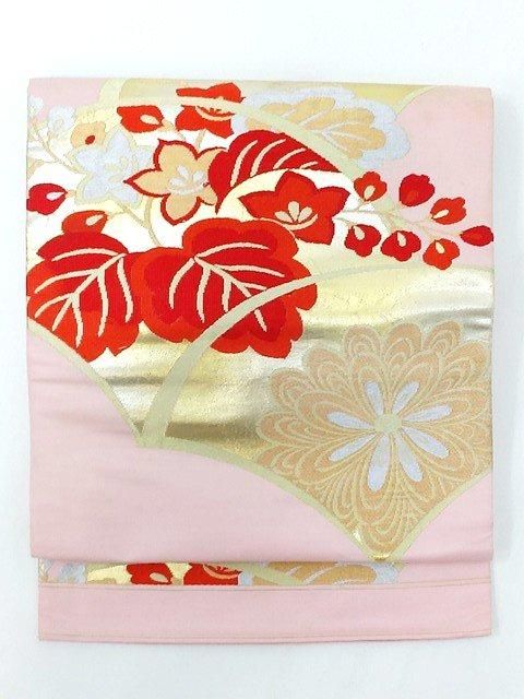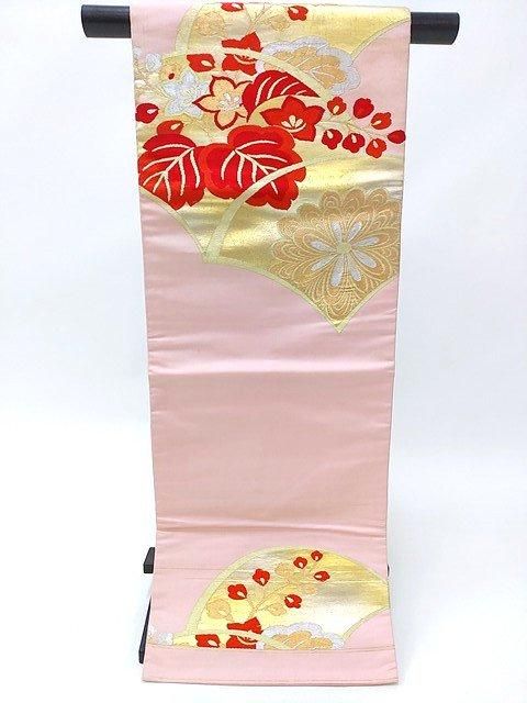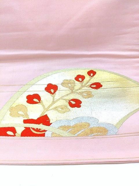 ■ピンク色に菊・竜胆・桐の花の入った金の青海波柄の名古屋仕立ての帯です。