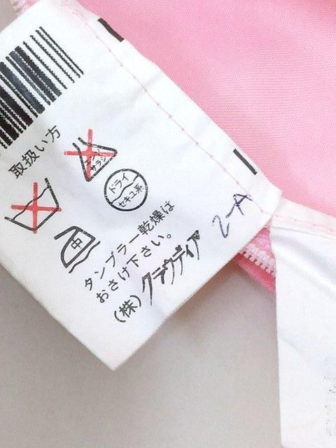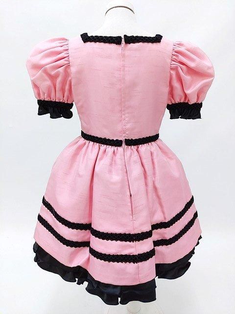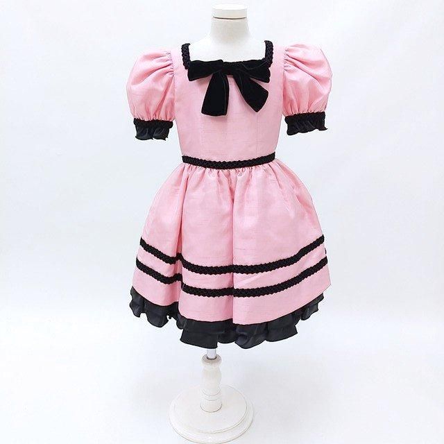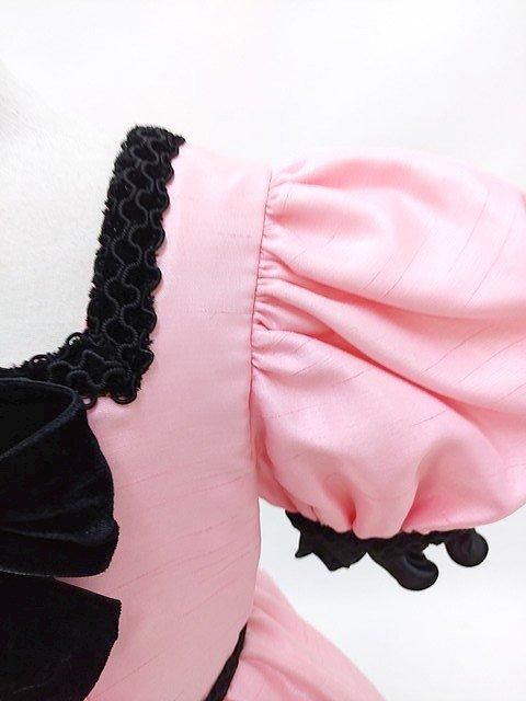 ■ピンクのシャンタン生地のパフスリーブに黒のベルベット調生地のリボンが付いています。