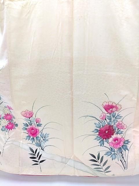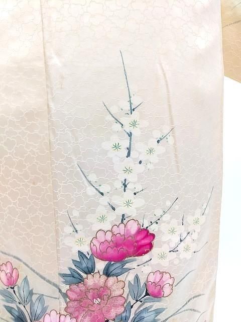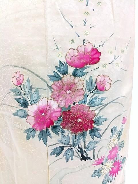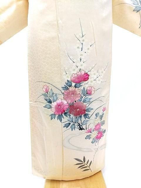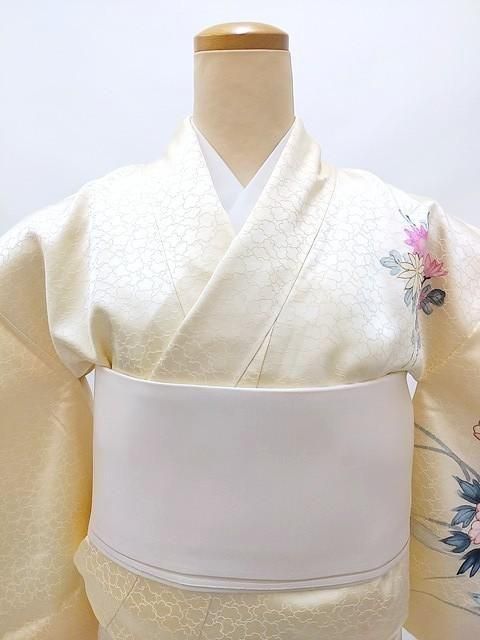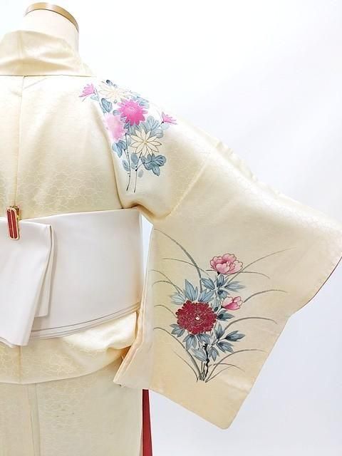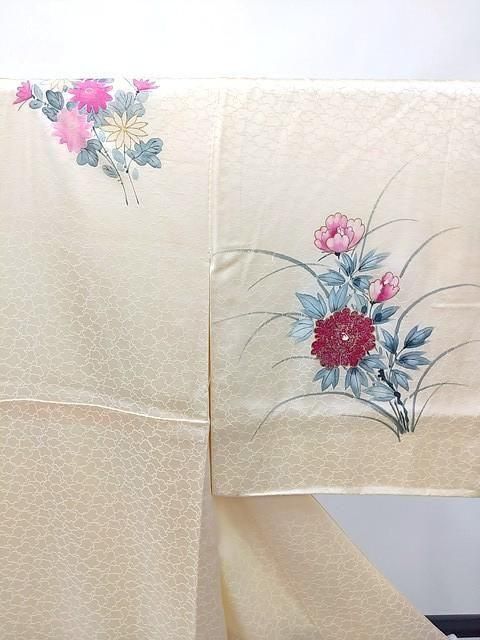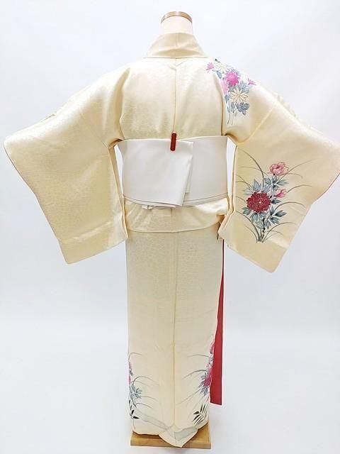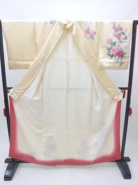 ■黄色系、クリーム色に赤い牡丹・菊、白い梅の花の付け下げ訪問着です。