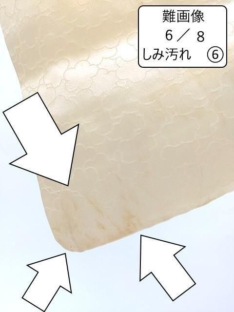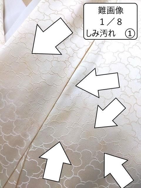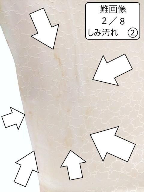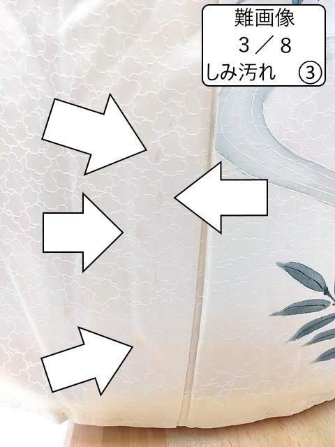 ●上前(左前)、左右の袖や左衿近くなど、しみ汚れが全体に多数付いています。