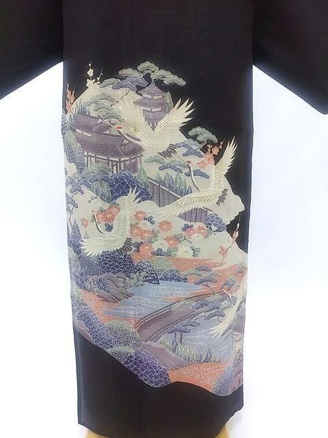 ■流水に橋、松・梅・菊に鶴の柄の夏着物、絽の黒留袖です。