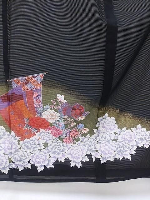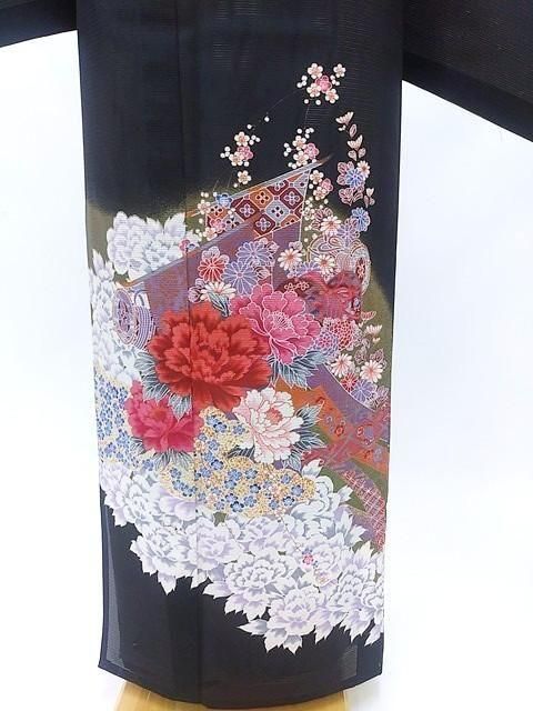 ■白っぽい芍薬の花に御簾・鼓の柄の夏着物、絽の黒留袖です。