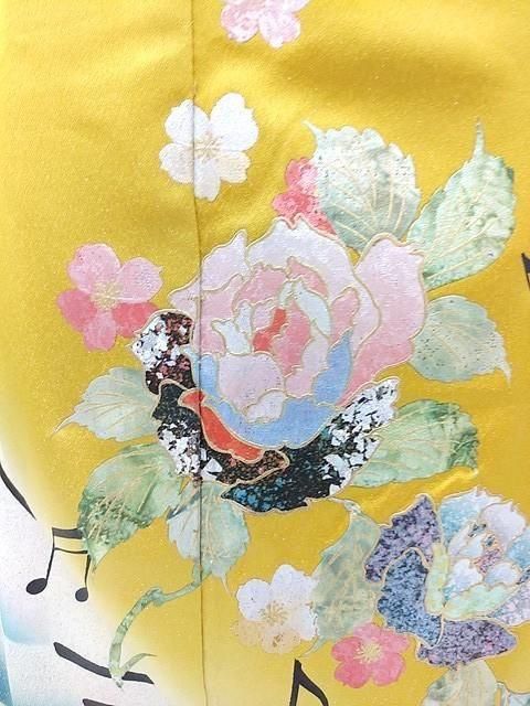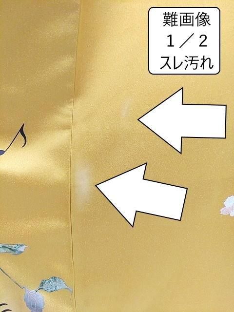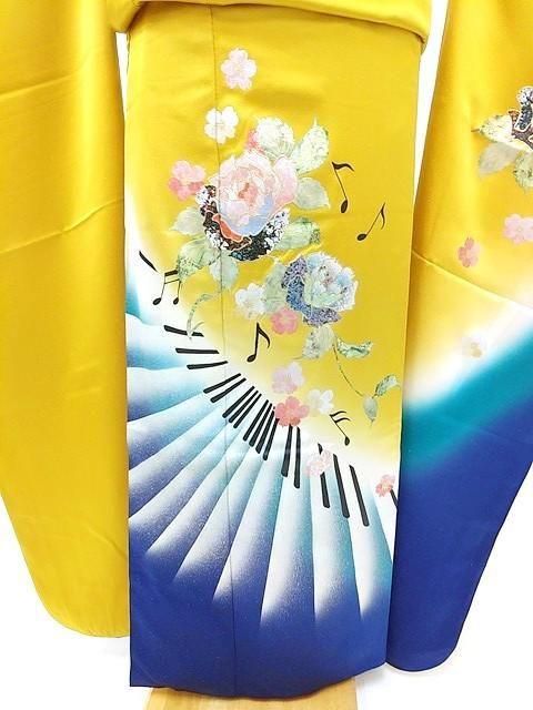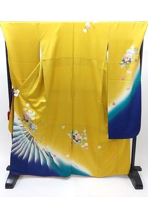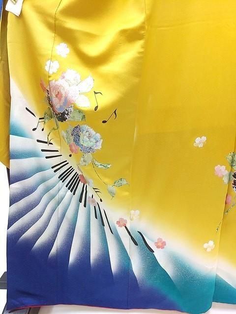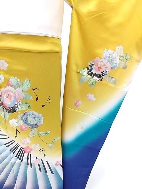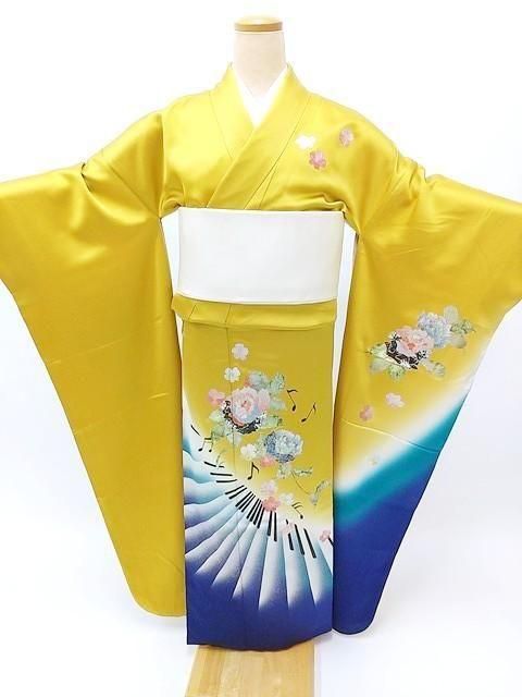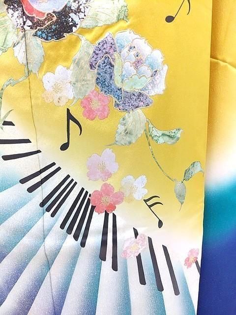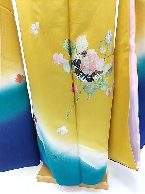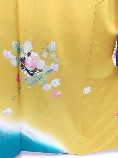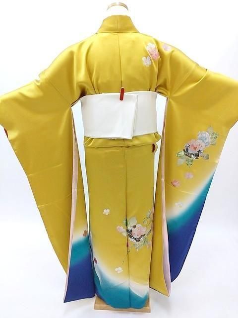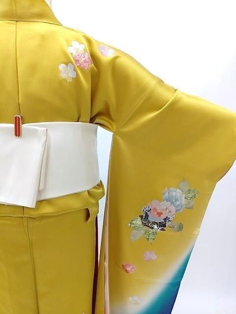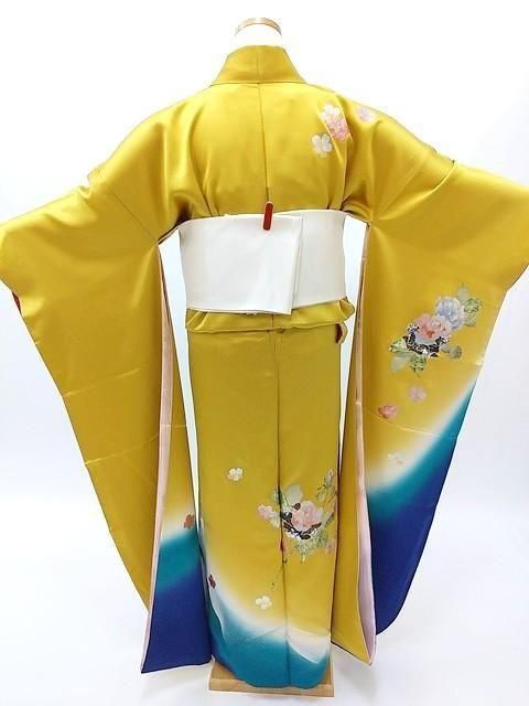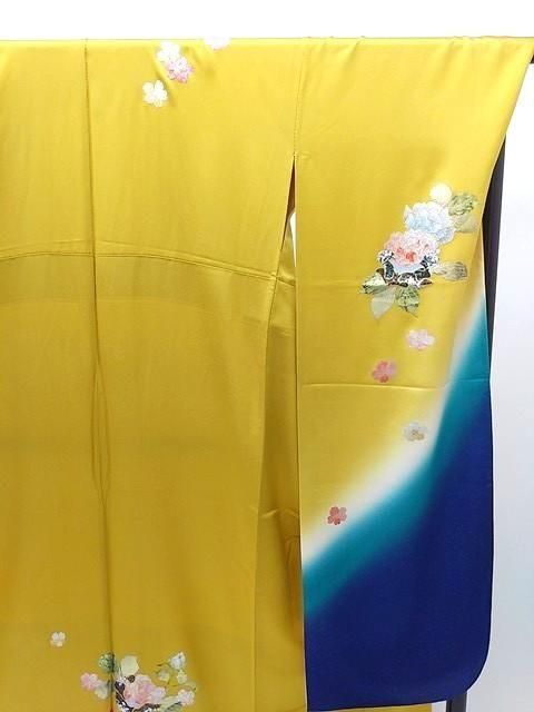 ■光沢のある黄金色に裾に青〜紺色のぼかし(グラデーション)が入ったL〜LLサイズの振袖です。