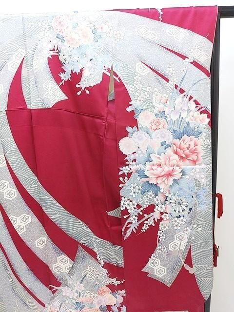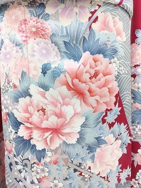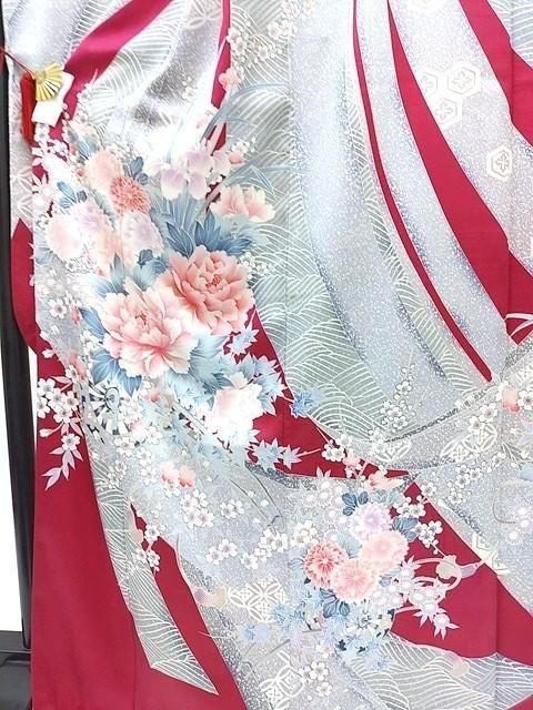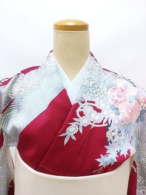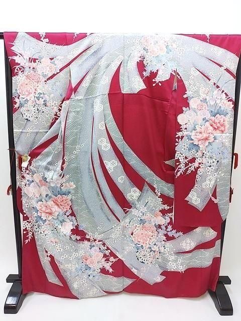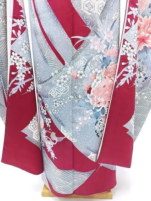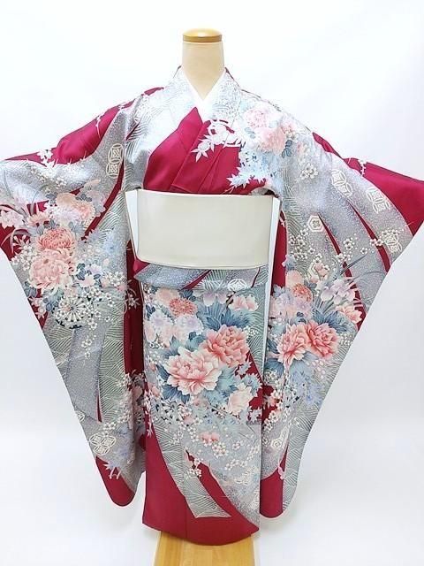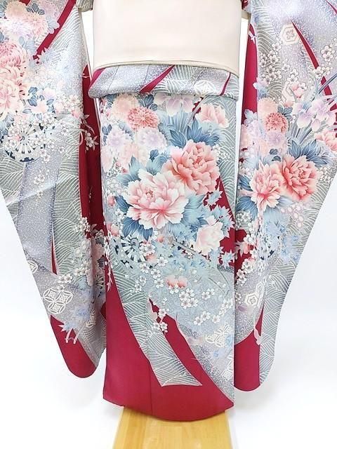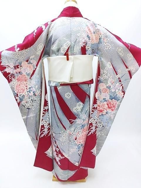 ■えんじ色、深い赤色に灰色、グレーの束ね熨斗柄のM〜Lサイズの振袖です。