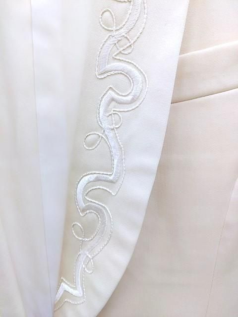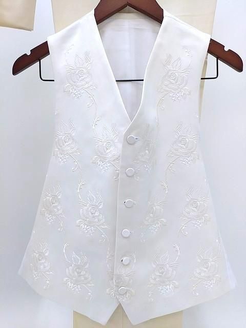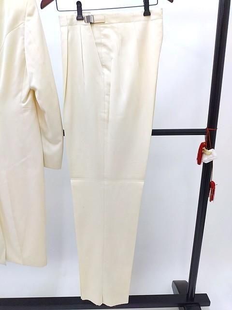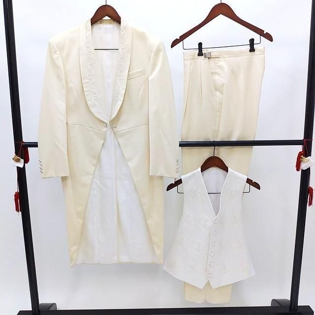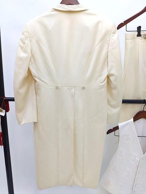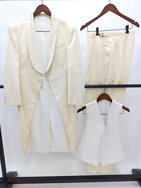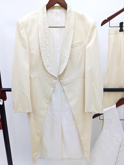 ■白系、アイボリーカラーのモーニング型のジャケットとズボン・ベストの3点セットです。