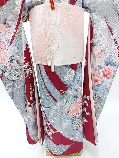 ■えんじ色、深い赤色に灰色の大きな束ね熨斗柄の振袖に淡いピンクの袋帯をコーデしました。