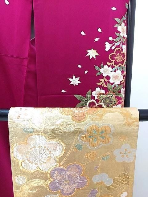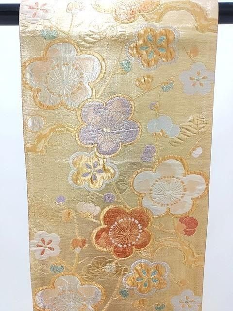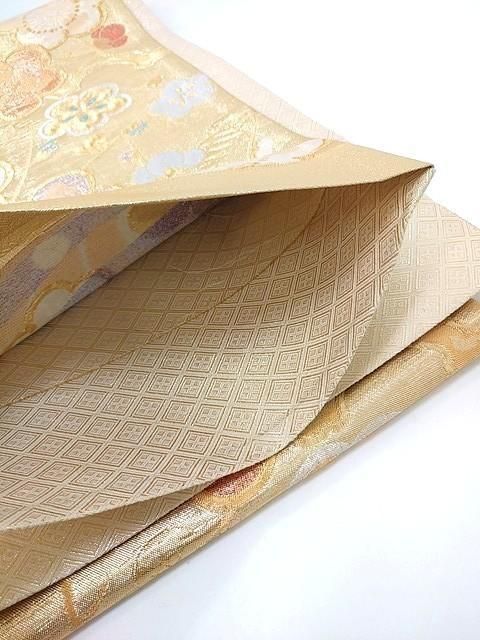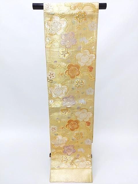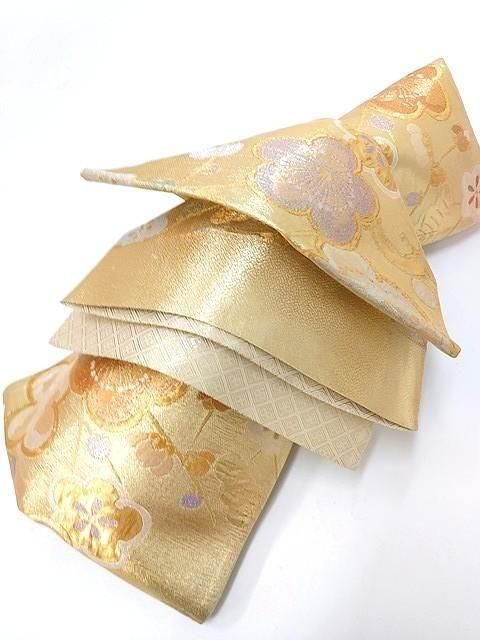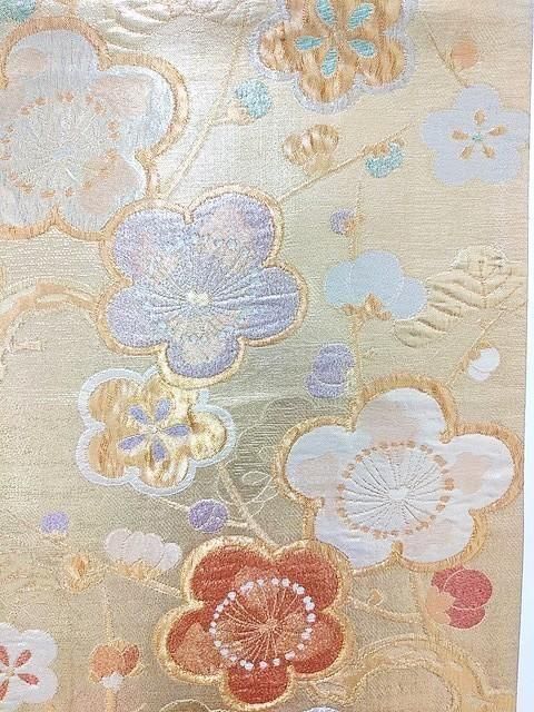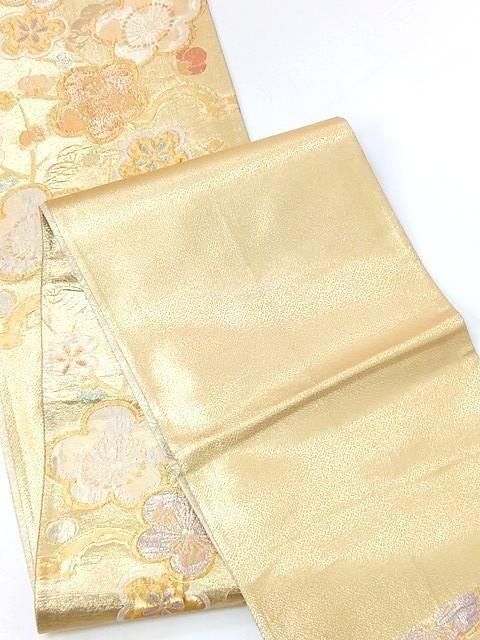 ■袋帯は淡い金色に梅柄の帯心入れと短辺かがりがされていない帯です。