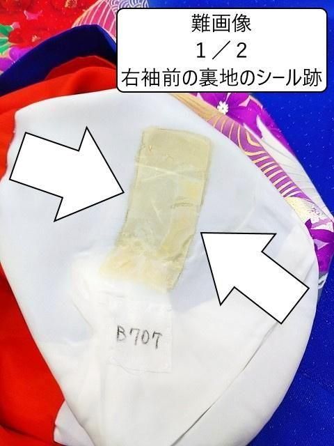 ●右袖の前、丸み近くの裏地に貸衣装店のシールが貼られており、接着剤の跡が表にしみ汚れとして出ています。