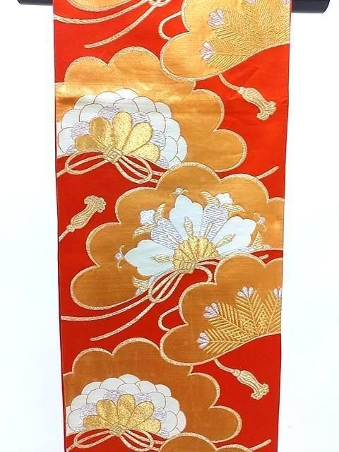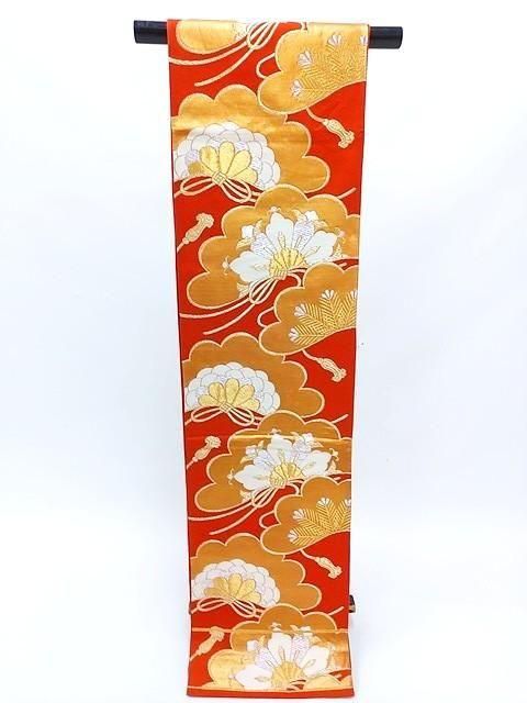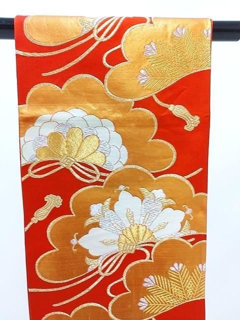■明るい朱赤色に金の松に組み紐柄の袋帯です。