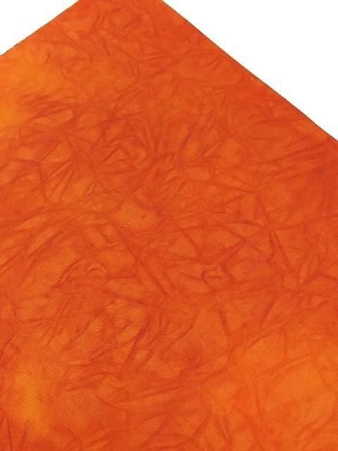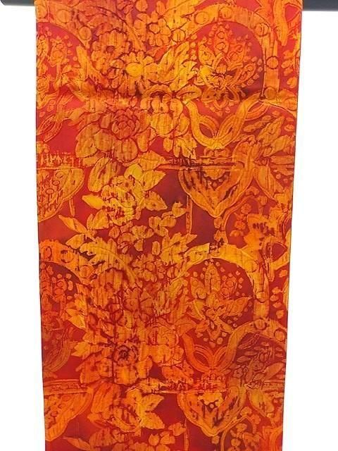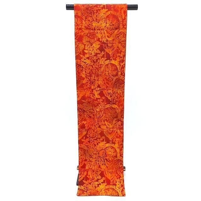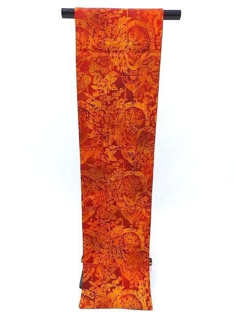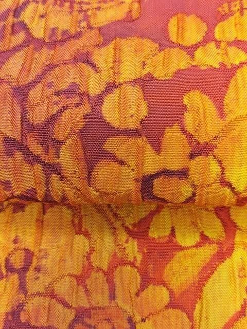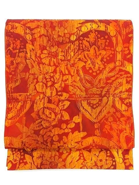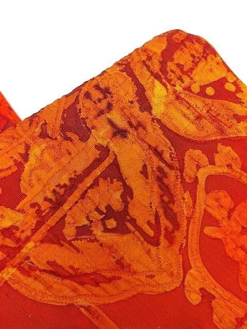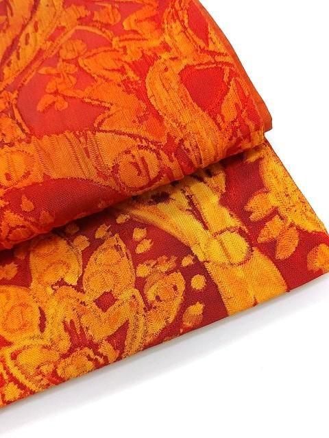 ■明るい朱赤色に黄色に近いオレンジの織り柄が入った変わり織りの袋帯です。