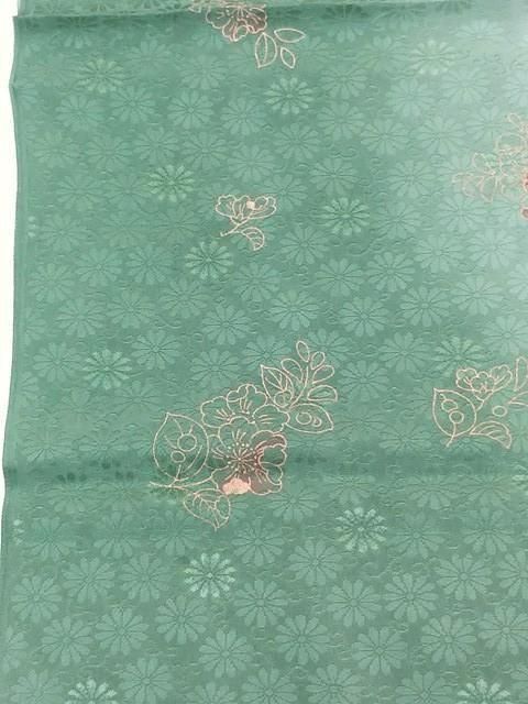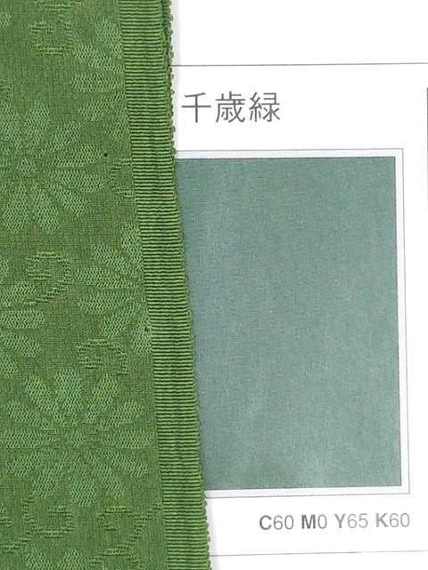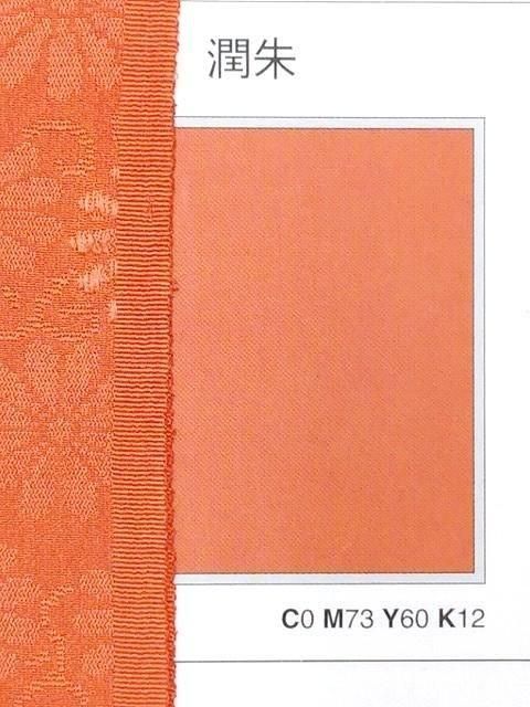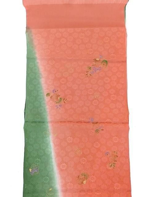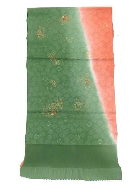 ■正絹の帯揚げ、潤朱(オレンジ系)と緑色の染め分け生地に菊の花地紋と花柄が入っています。