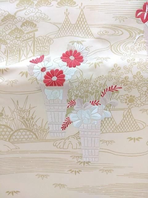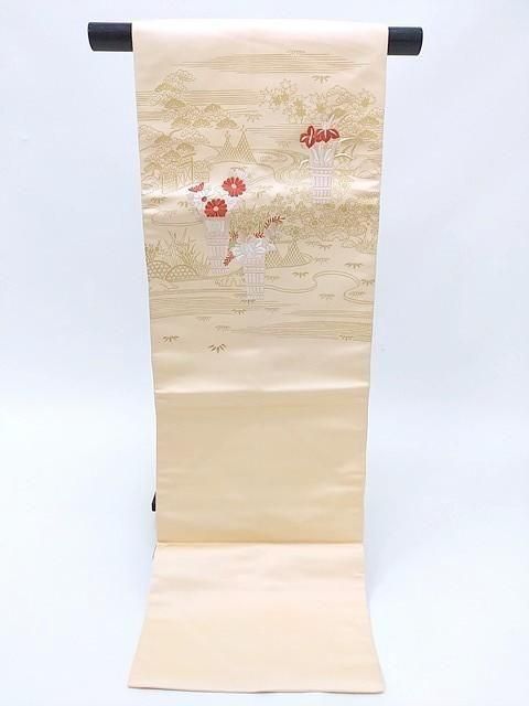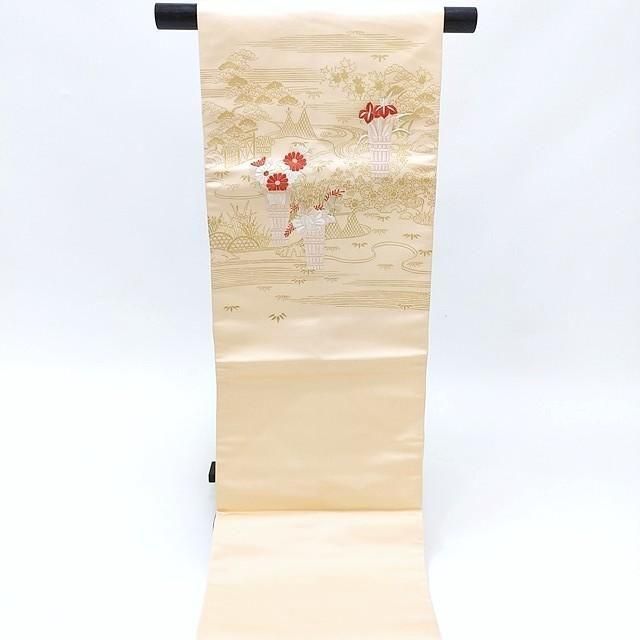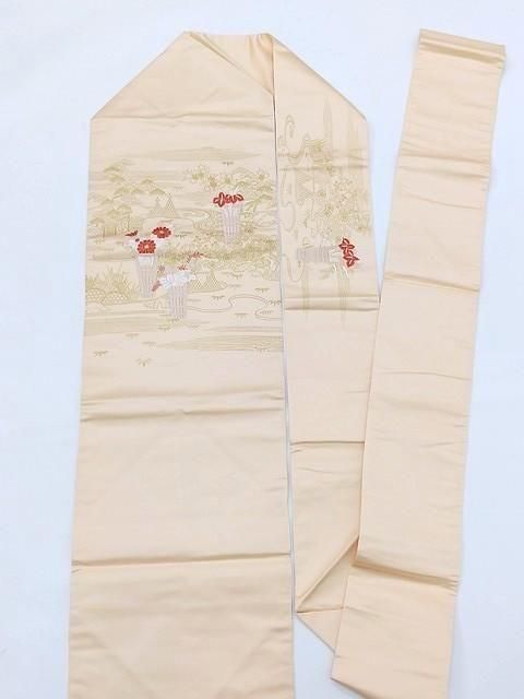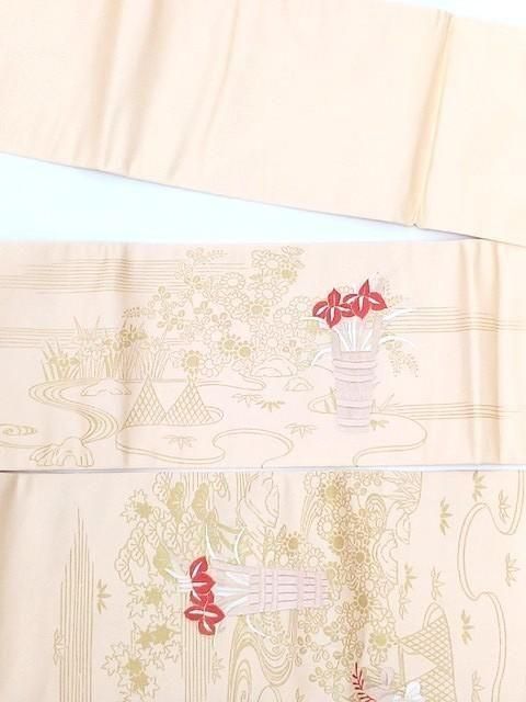 ■淡い金色、ゴールドベージュに刺繍柄のワンポイント柄の名古屋帯です。
