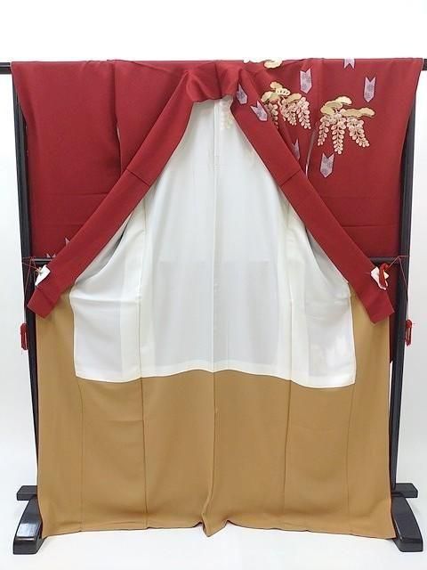 ■落ち着いた赤色にベージュ色の松藤と矢羽柄のシンプルな古典柄の振袖に金色、ゴールドの袋帯をコーデしました。