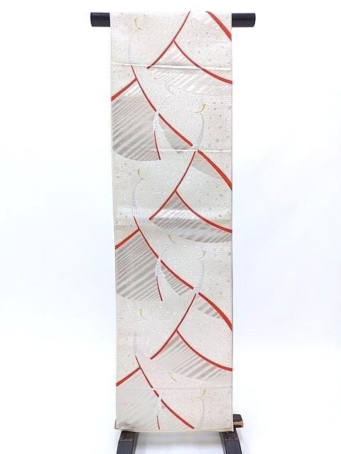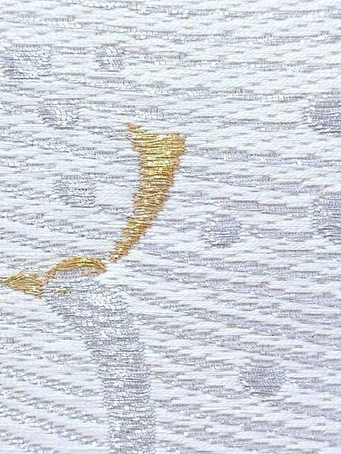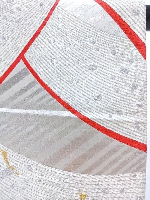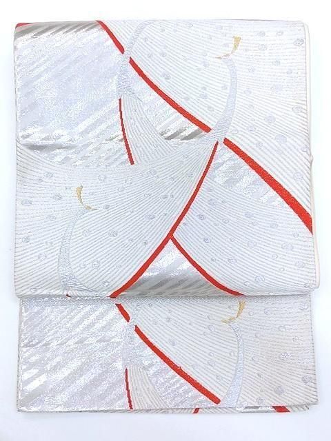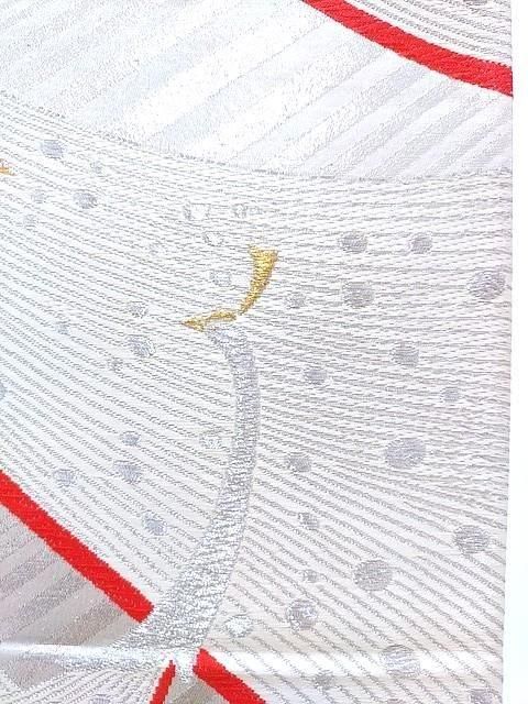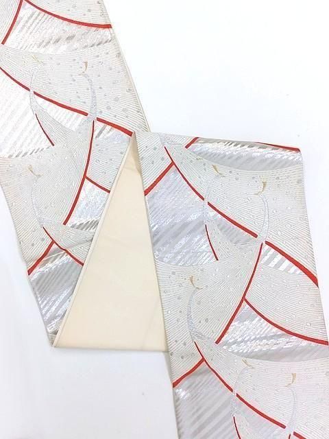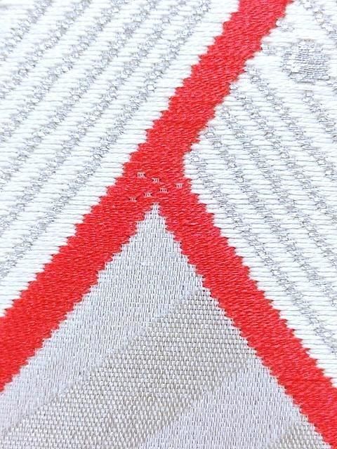 ■銀色に朱赤色の線が入った孔雀柄の袋帯です。