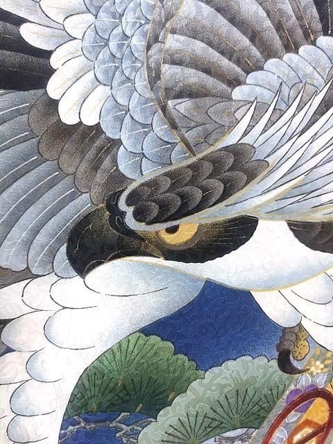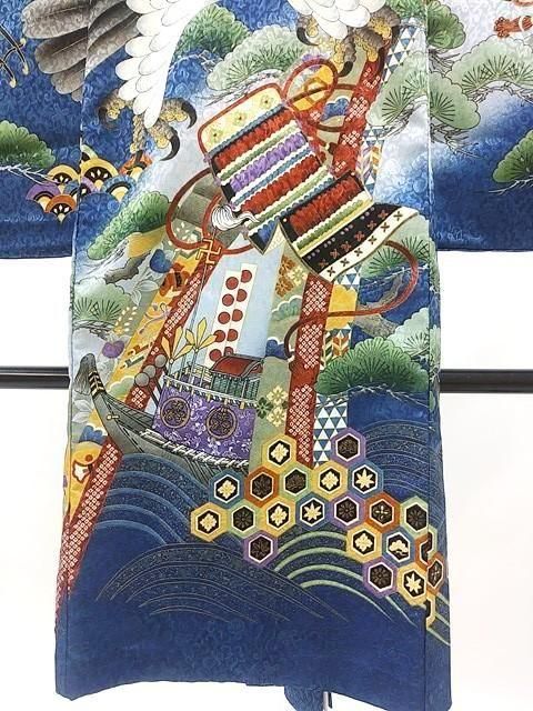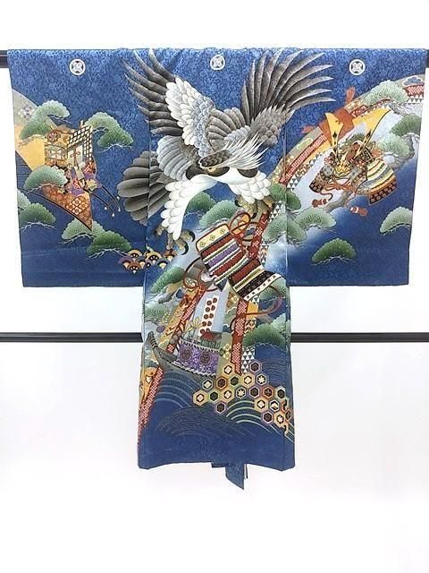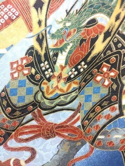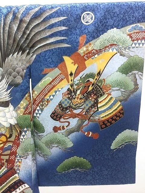 ■青灰色に鷹・兜・御所車柄の着物とピンクの長襦袢のセットです。