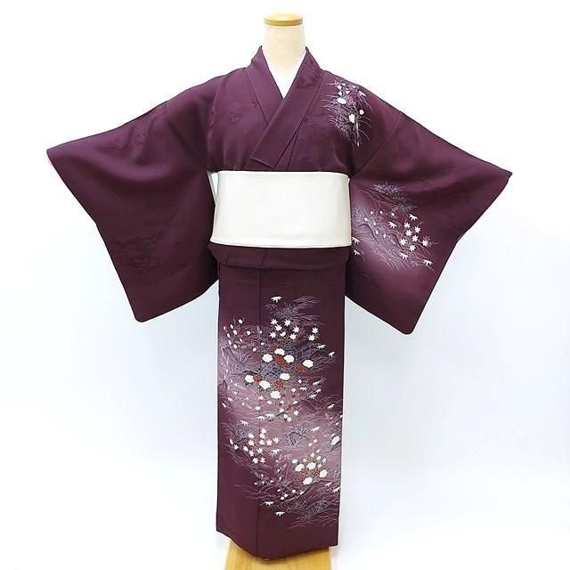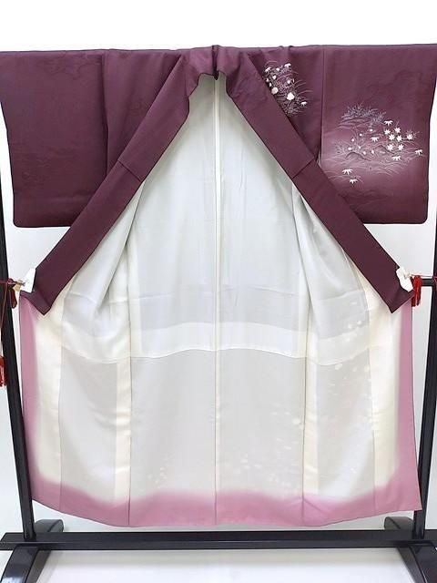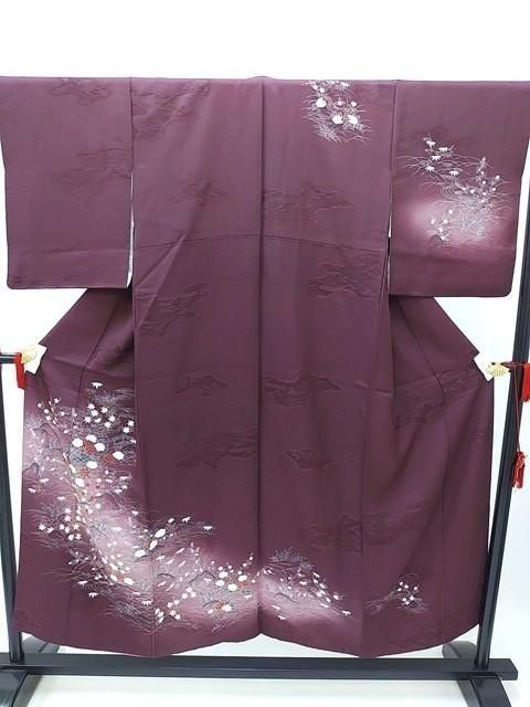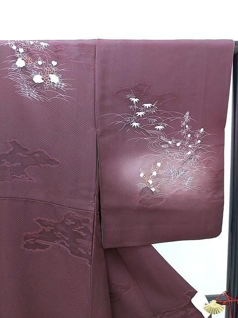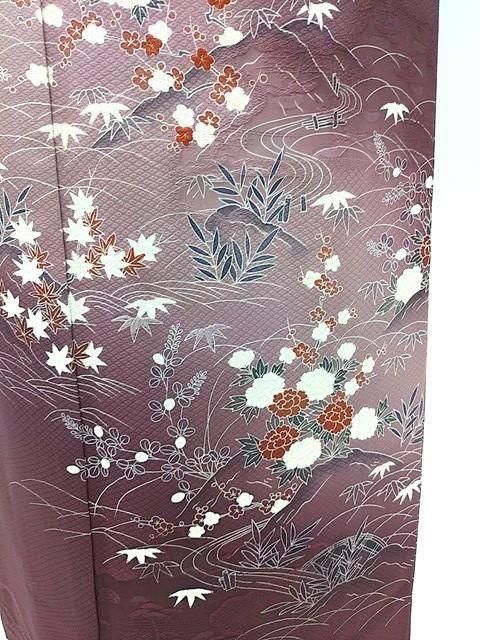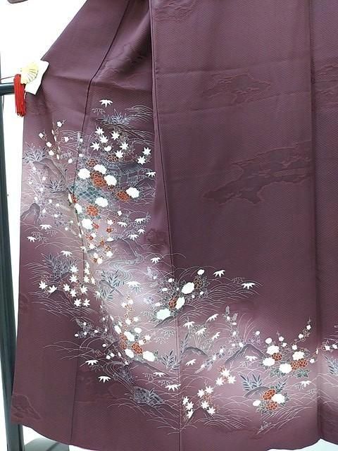 ■濃い紫色に秋の菊や紅葉、春の梅、冬の牡丹の花柄の訪問着です。