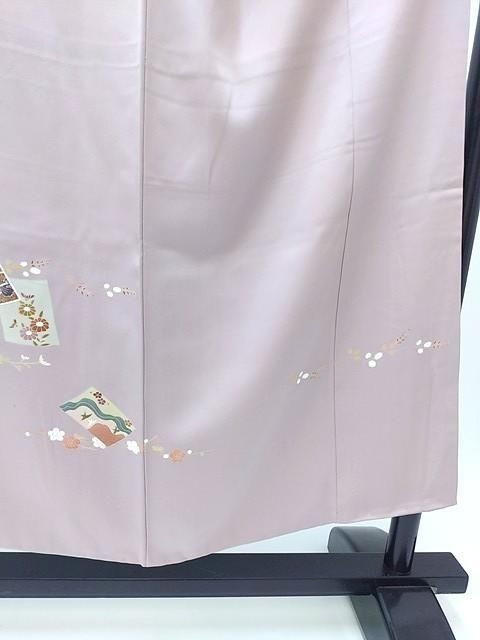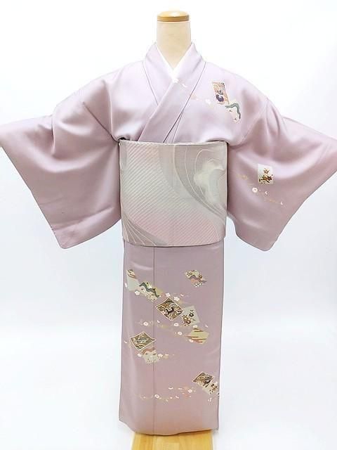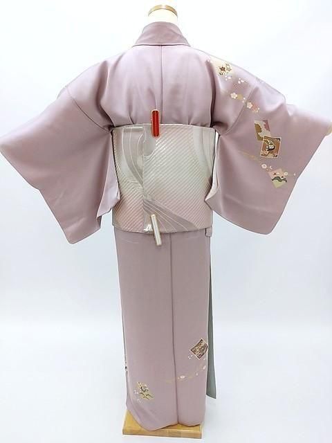 ■柔らかな紫色、藤色に梅・菊の花、色紙文様の訪問着にシルバーピンク系の袋帯をコーデしました。