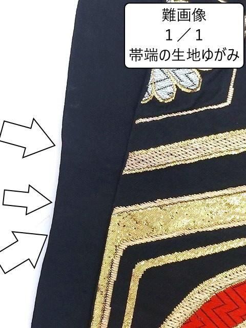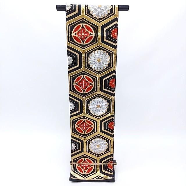 ■黒地に金色の六角、中に銀の菊の花と赤の七宝に花菱紋のレトロ帯です。