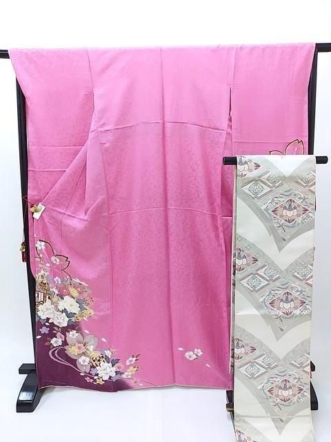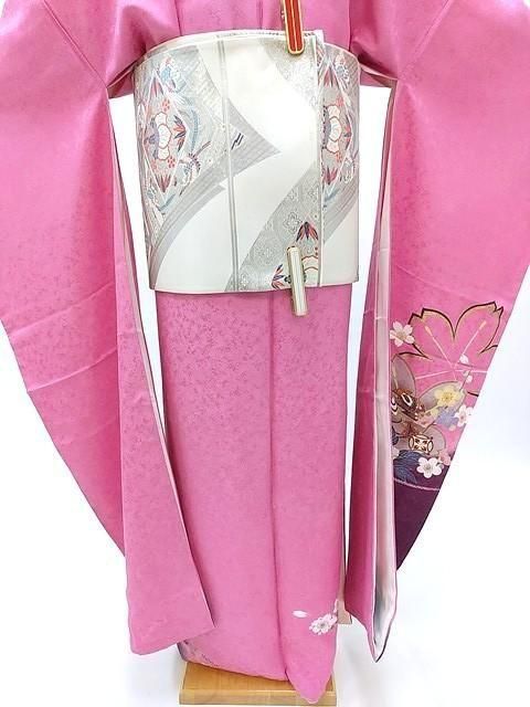 ■濃いピンクに大きな桜の花柄と御所車の古典柄振袖にシンプルな白・銀色の帯をコーデしました。