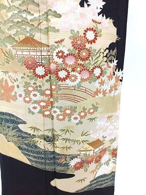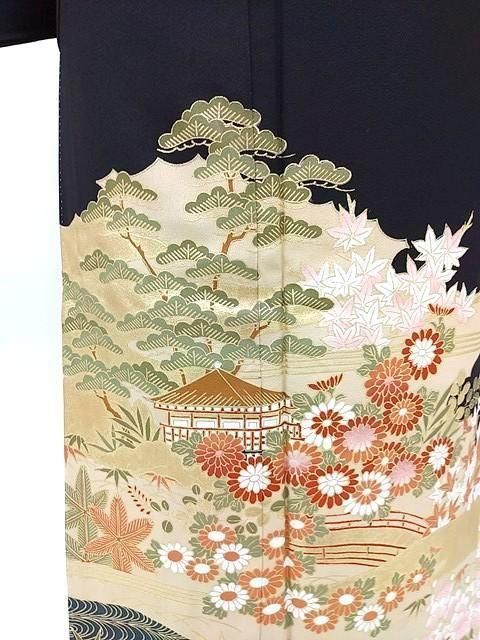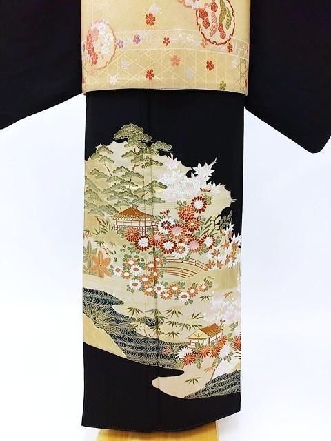 ■金の箔を使った松や紅葉、菊などの草木に橋と寺社柄の黒留袖に金色、ゴールドの礼装用袋帯をコーデしました。