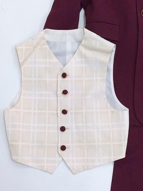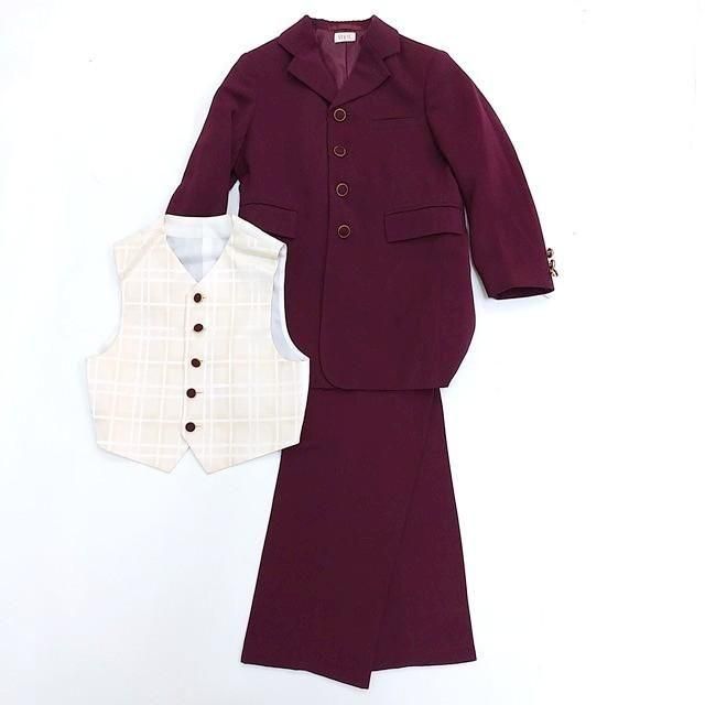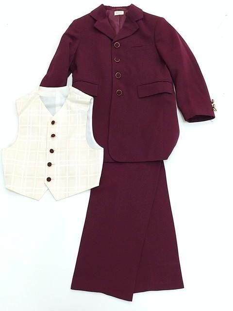 ■赤紫、ワインレッドのジャケットとズボンにベージュカラーの織り柄生地のベストセットです。