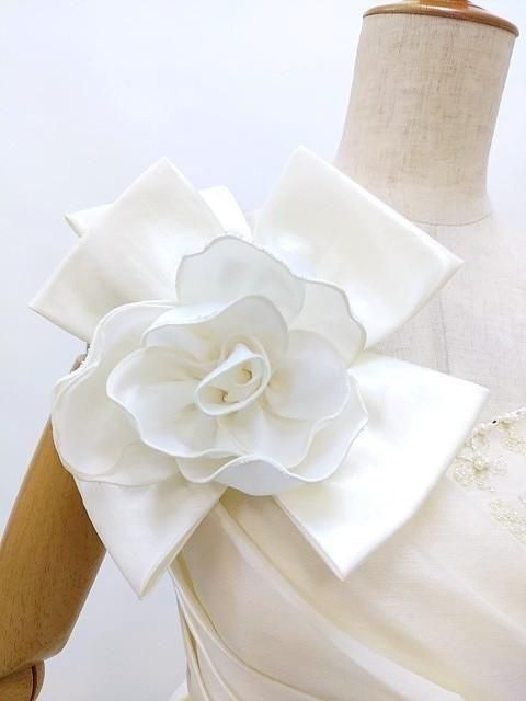 ■右肩に太めのデザインストラップとコサージュが飾られています。